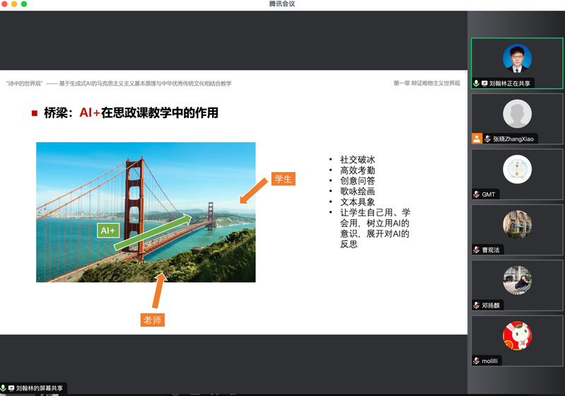 在会议第一环节,刘翰林博士结合暑期参加全国高校思想政治理论课教师研修基地“藏之名山传之后世”主题研修班学习心得,基于“马克思主义唯物论”知识点,以“诗中的世界观”为主题,阐释了经典诗词中蕴含的正确世界观。其中,刘老师具体展示了人工智能操作方法,包括将古诗句与矛盾知识点相结合进行文本创作、绘图创作,就物质概念与学生开展模拟辩论等。刘老师分析了人工智能在课堂运用过程中可能遇到的挑战,提出了相应解决方法,最后对应用这一技术可能达到的教学效果进行了评估。