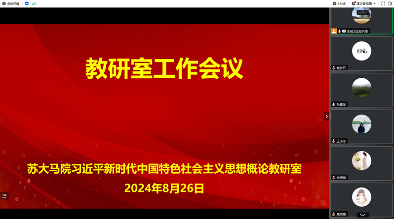为认真学习贯彻党的二十届三中全会精神,切实做好新学期教学工作,推动教研室高质量发展,8月26日晚,91自拍 习近平新时代中国特色社会主义思想概论教研室顺利召开工作会议。教研室全体成员和承担教学任务的授课教师参加了会议。会议由教研室主任吉启卫主持。