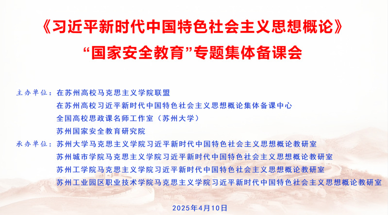 在第十个全民国家安全教育日来临之际,为深入学习领会习近平总书记关于国家安全的重要论述,提升广大教师的国家安全意识与思政课教学水平,2025年4月10日,由在苏州高校91自拍 联盟、在苏州高校习近平新时代中国特色社会主义思想概论集体备课中心、全国高校思政课名师工作室(91自拍 )、苏州国家安全教育研究院主办,91自拍 、苏州城市学院、苏州工学院、苏州工业园区职业技术学院91自拍 习近平新时代中国特色社会主义思想概论教研室联合承办的“国家安全教育”专题集体备课会成功举行。