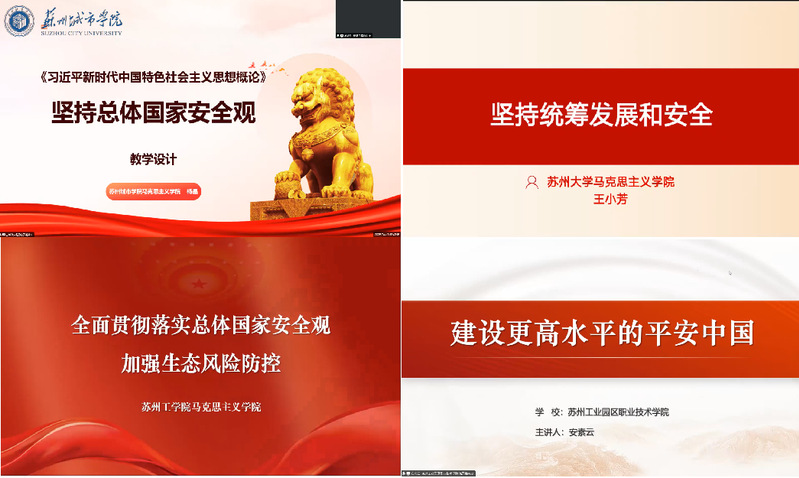 91自拍 王小芳老师、苏州城市学院91自拍 杨晶老师、苏州工学院91自拍 戴明新老师、苏州工业园区职业技术学院91自拍 安素云老师分别围绕“坚持总体国家安全观”“坚持统筹发展和安全”“全面贯彻落实总体国家安全观 加强生态风险防控”“建设更高水平的平安中国”四个专题,聚焦学情分析、教学设计、教学重难点、教学反思等进行展示。