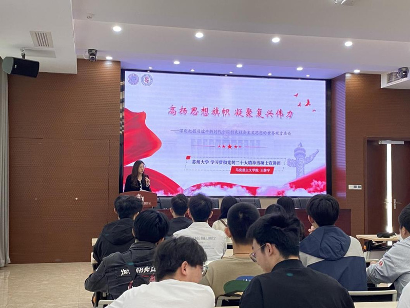 研究生第一党支部组织委员王林宇做题为“高扬思想旗帜 凝聚复兴伟力——深刻把握习近平新时代中国特色社会主义思想的世界观方法论”的宣讲。她从“传承”“超越”“坚持”三个角度详细阐述了习近平新时代中国特色社会主义思想的世界观方法论,并强调要通过学习“六个坚持”来运用好贯穿其中的立场观点方法,不断推进马克思主义实践基础上的理论创新。