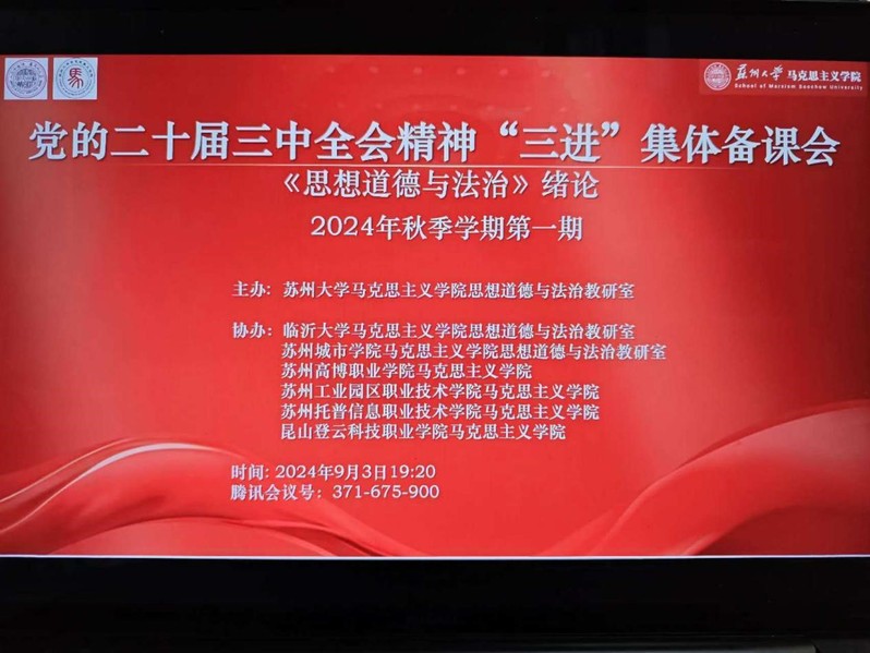 为积极推进党的二十届三中全会“三进”工作,9月3日晚,由91自拍 思想道德与法治教研室主办,临沂大学、苏州城市学院以及苏州高博职业学院、苏州工业园区职业技术学院、苏州托普信息职业技术学院、昆山登云科技职业学院六所高校91自拍 协办的集体备课会成功举办。七所学校的“思想道德与法治”课专兼职老师共60余人参加备课会,91自拍 副院长朱蓉蓉出席会议,会议由91自拍 思想道德与法治教研室主任顾宏松主持。