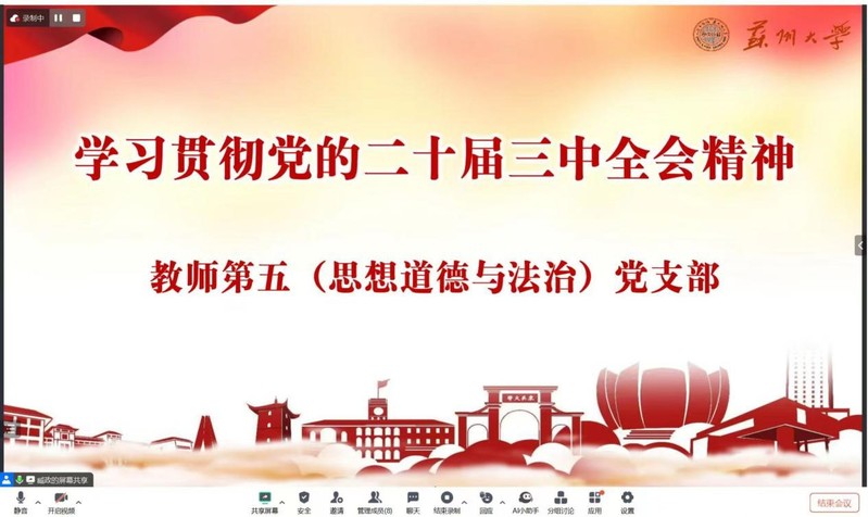 9月3日,教师第五党支部举行了以“学习贯彻党的二十届三中全会精神”为主题的党日活动。此次活动旨在深入学习和领会党的二十届三中全会精神,进一步增强党员教师的政治意识和责任担当。支部书记臧政老师带领支部全体党员认真学习了《中共中央关于进一步全面深化改革、推进中国式现代化的决定》,并就党的二十届三中全会的重大意义、总体要求以及《决定》的主要内容进行了阐述。党的二十届三中全会是中国共产党在新时代背景下召开的重要会议,对于全面贯彻落实习近平新时代中国特色社会主义思想,推进党和国家事业发展具有里程碑意义。支部全体党员一致认为要深刻领会会议精神,明确奋斗目标,以更加坚定的信心和高度的政治自觉投入到实际工作中去。