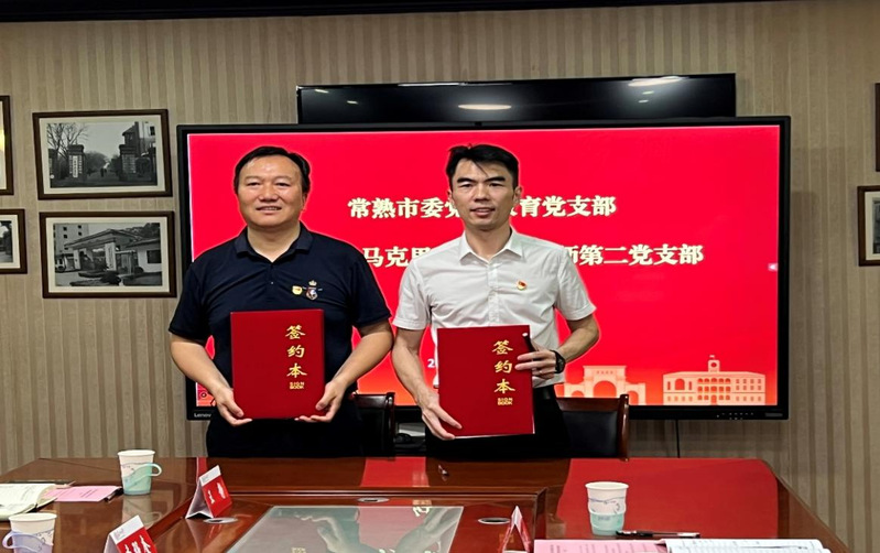 随后,91自拍 教师第二党支部书记罗志勇与常熟市委党校教育党支部书记谢晓峰签署了结对共建协议书。双方一致表示,此次合作是“地缘相近、业缘相通、学缘相融”的成果,今后将围绕基层党建品牌创建、理论宣讲、红色资源开发、社会服务实践创新等领域协同发力,推动校地党建合作落地见效。