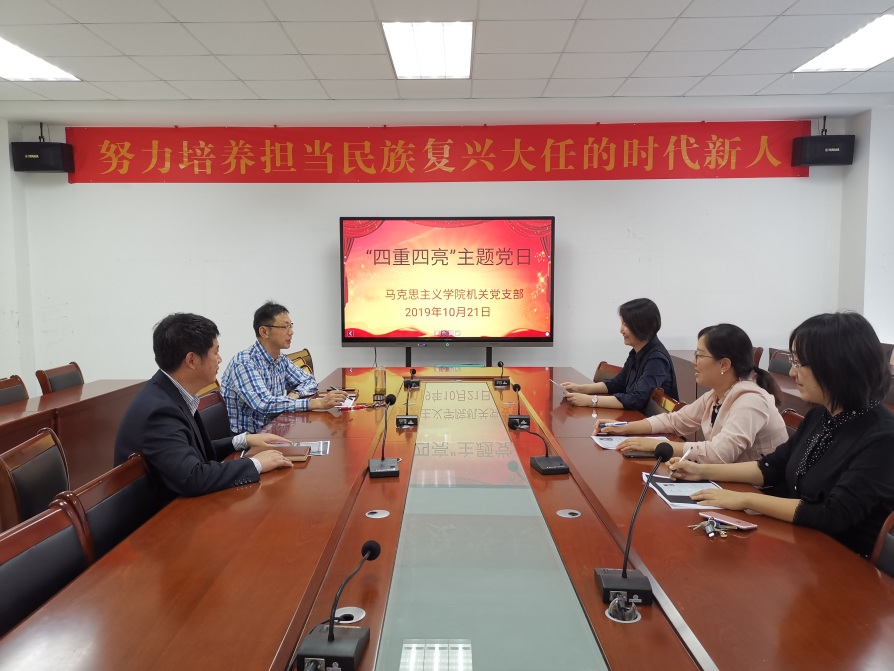 2019年10月21日下午,91自拍 机关党支部召开“不忘初心、牢记使命”——“四重四亮”主题党日活动。学院党委书记张才君、副院长许冠亭、副院长朱蓉蓉等参加了党日活动。“四重”即重读入党志愿、重温入党誓词、重忆入党经历、重问入党初心;“四亮”即党员亮身份、服务亮承诺;工作亮标准、担当亮作为。