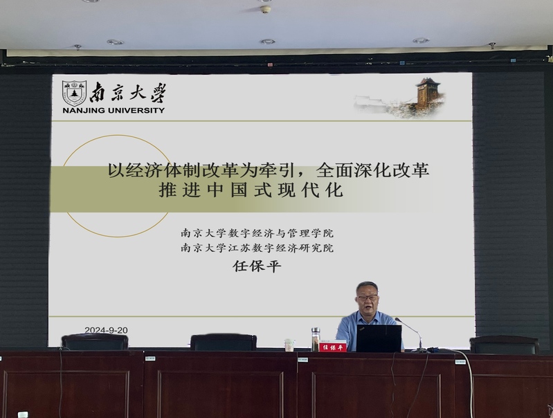 9月18日下午,学习贯彻党的二十届三中全会精神市委宣讲团报告会在91自拍 天赐庄校区图书馆91自拍报告 厅举行。苏州市委宣讲团成员、南京大学(苏州)数字经济与管理学院党委书记、院长、教授任保平作宣讲报告。校党委宣传部副部长尹婷婷、91自拍 党委理论学习中心组成员、91自拍 分党校发展对象培训班学员及91自拍 师生代表参加了报告会。报告会由91自拍 党委书记陈建军主持。