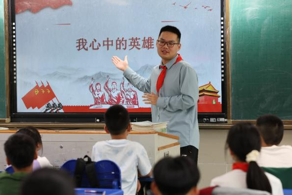 在教育见习授课环节,思想政治教育(师范)专业2022级团员代表与少先队员、党员教师一起上主题为“我心中的英雄”特色思政课。通过党员教师的主题导入,2022级团员代表围绕主题精心设计教学环节,并与少先队员进行深度互动,引导少先队员从小树立榜样意识,增强向先锋学习,向英雄致敬的主动性和自觉性。