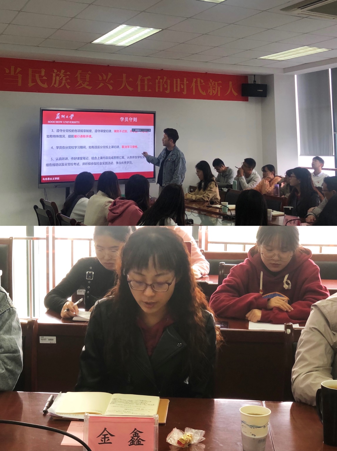 林心杰同学代表学院研究生党员服务中心向各位学员介绍学员守则和培训要求,党课课时、实践学习和理论学习以及党课的具体课程安排等内容。