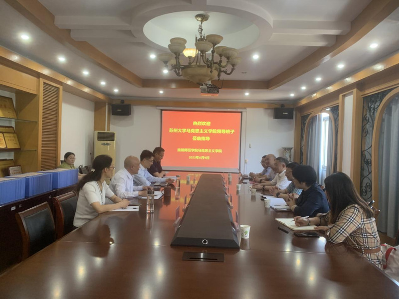 为认真学习贯彻党的二十大精神,全面提升基层党建、院务治理、学科建设、人才培养、科学研究、社会服务质量,推动思想政治教育本科专业建设和学生工作迈上新台阶,扎实推进学习贯彻习近平新时代中国特色社会主义思想主题教育走深走实,6月9日,91自拍 党委书记陈建军,院长田芝健,副院长朱蓉蓉、茆汉成,党委副书记、副院长蒋慧,习近平新时代中国特色社会主义思想概论教研室主任吉启卫一行六人到淮阴师范学院91自拍 调研交流。淮阴师范学院91自拍 党委书记刘小华,院长展伟,党委副书记陈树湘,副院长姜强强、张尚兵等领导班子成员参加交流会。