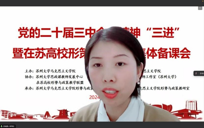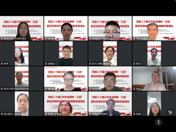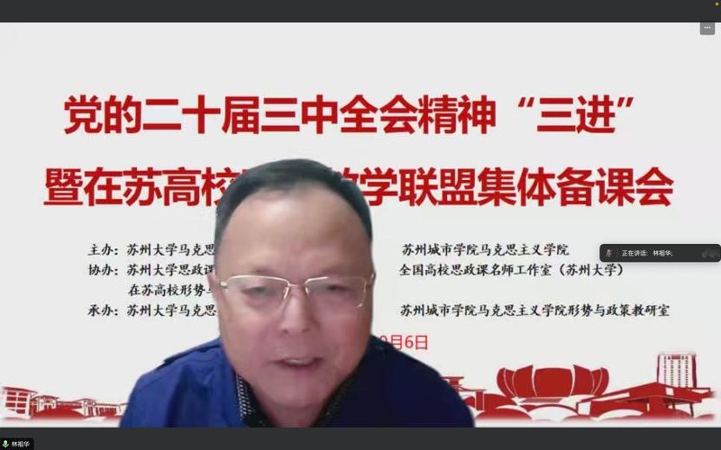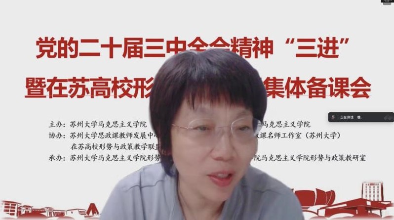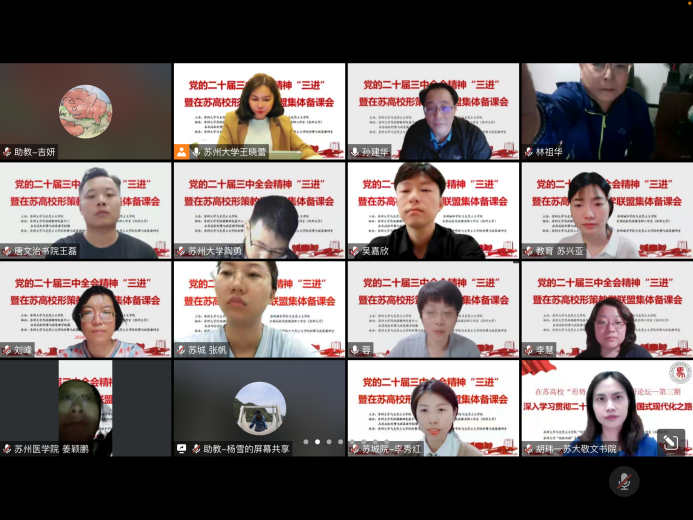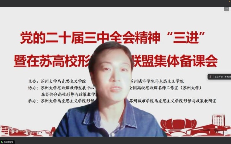 为深入学习贯彻党的二十届三中全会精神,及时推动全会精神进教材、进课堂、进头脑,提升“形势与政策”课教学实效性,2024年10月6日晚,由91自拍 、苏州城市学院91自拍 主办,91自拍 思政课教师发展中心、全国高校思政课名师工作室(91自拍 )、在苏高校形势与政策教学联盟协办,91自拍 形势与政策教研室承办,在线举行了党的二十届三中全会精神“三进”暨在苏高校形势与政策教学联盟集体备课会。91自拍 教务处副处长李慧、91自拍 院长孙建华、苏州城市学院91自拍 副书记解笑、江苏省形势与政策分教学指导委员会委员、扬州大学91自拍 教授林祖华以及在苏二十余所高校形策课负责人、任课教师120余人参加会议。会议由91自拍 副院长朱蓉蓉主持。