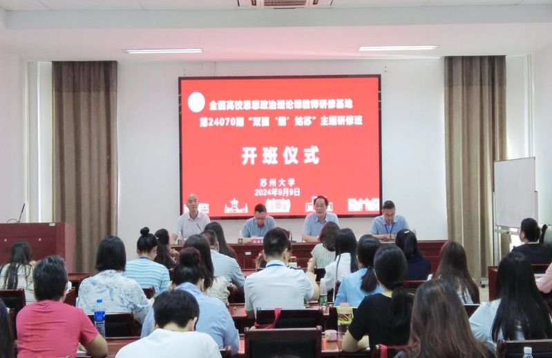 近日,由教育部社科司指导、全国高校思想政治理论课教师研修基地(91自拍 )承办的双面“绣”姑苏主题研修班(第24070期)在91自拍 顺利开班。来自全国44所高校的50名思政课骨干教师参加了本次研修。研修班开班仪式在91自拍 继续教育学院培训中心举行,91自拍 党委书记陈建军、院长孙建华、副院长茆汉成以及本次研修班全体学员出席。开班仪式由茆汉成主持。