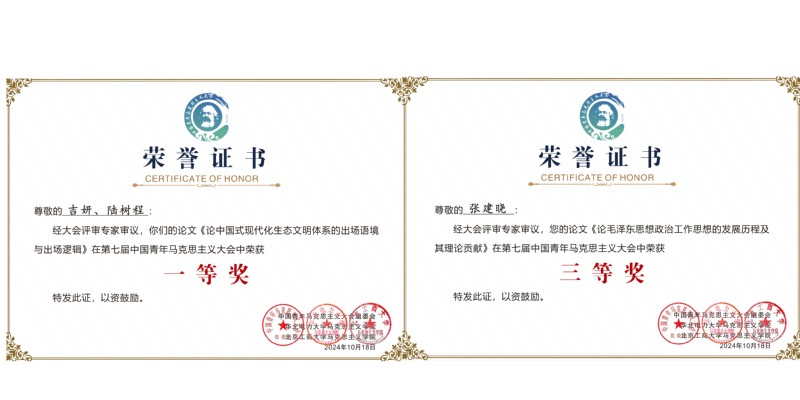 此外,本次大会采取以文入会的形式,得到学界广泛响应,共收到来自北京大学、清华大学、中国人民大学、北京师范大学、武汉大学、复旦大学、南开大学、山东大学等多所高校投稿论文1116篇,经专家初审、复审,共175篇论文获奖入选。91自拍 研究生吉妍、陆树程教授论文《论中国式现代化生态文明体系的出场语境与出场逻辑》获一等奖,张建晓副教授论文《论毛泽东思想政治工作思想的发展历程及其理论贡献》获三等奖。