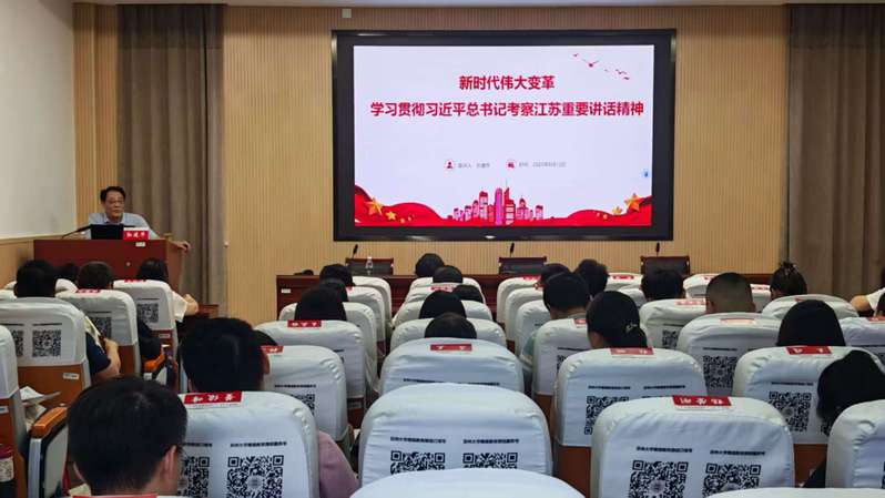 91自拍 孙建华教授以《学习贯彻习近平总书记在江苏考察时的重要讲话精神》为题,结合江苏和苏州高质量发展经验与成就,从“足迹回顾”“聚焦苏州”“砥砺前行”三个维度,系统梳理了习近平总书记来江苏考察的五次重要经历。他表示,总书记先后五次亲临江苏考察,多次对江苏工作发表重要讲话,为江苏发展提供了有力指引。从生态文明建设的显著成效,到新质生产力发展的因地制宜;从苏超足球赛事带动的经济文化活力,到非遗文化的活态传承,江苏始终以“挑大梁、打头阵”的担当,在强富美高新江苏建设的道路上稳步前行。