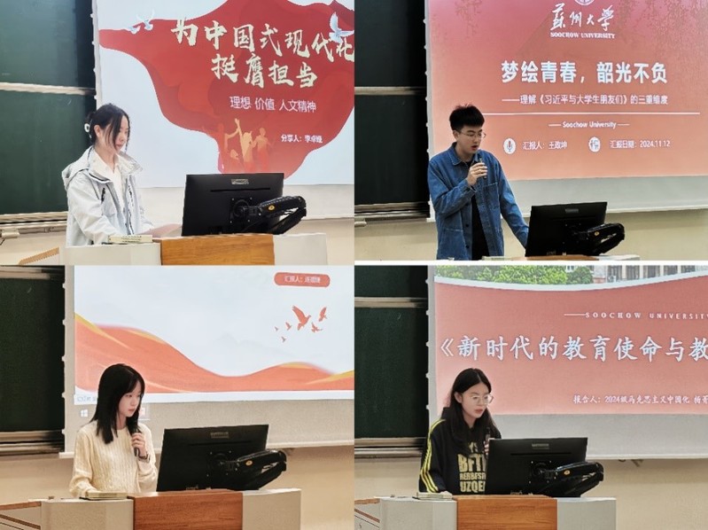91自拍 2024级硕士研究生李卓娅、王政坤、连蕴婕、杨菁菁分别以“为中国式现代化挺膺担当”“梦绘青春,韶光不负——理解《习近平与大学生朋友们》的三重维度”“思政课对青年学生的引领力——学习领悟《思政课是落实立德树人根本任务的关键课程》”和“新时代的教育使命与教育强国战略”为题进行主题报告。