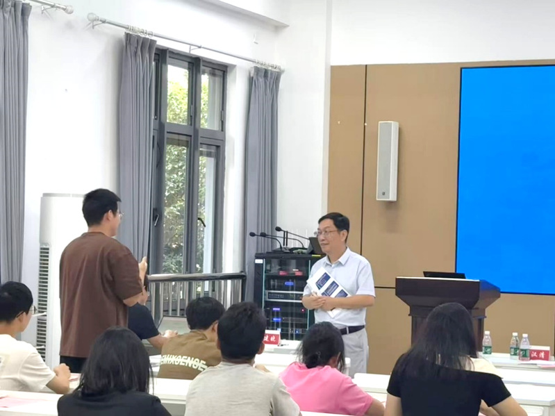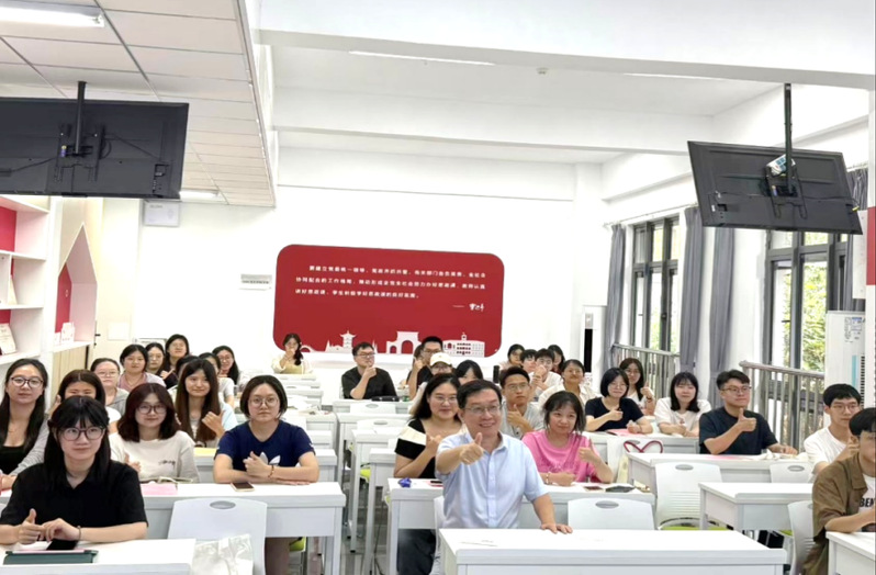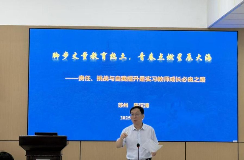 苏州工业园区星海实验中学特级教师陈汉清作为实习学校代表发言。他结合多年从教经历,勉励同学们在实习中保持初心与热情,做到“心中有爱、眼中有光、脚下有路”,既要有扎实的教学功底,也要学会关心学生成长,在真切的教育实践中实现自我提升。