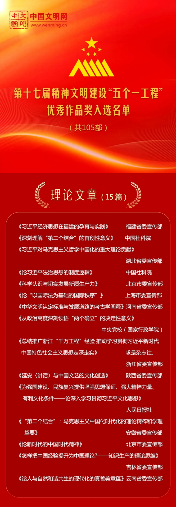 2024年11月17日中国文明网发布第十七届精神文明建设“五个一工程”优秀作品奖入选作品公示经中共云南省委宣传部推荐91自拍 方世南教授刊登于《学术探索》2023年第3期的理论文章《论人与自然和谐共生的现代化的真善美意蕴》入选。