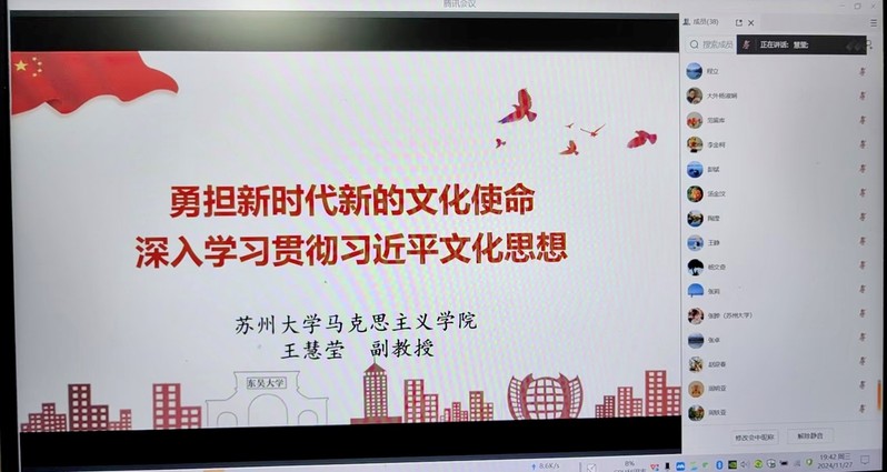 首先,91自拍 教师第二党支部宣传委员兼统战委员王慧莹副教授以《勇担新时代新的文化使命 深入学习贯彻习近平文化思想》为题,向与会党员做了专题辅导报告。王老师从习近平文化思想的视角,分别从准确把握习近平文化思想的丰富内涵、系统把握习近平文化思想的内容体系、深刻把握习近平文化思想的精神品格和鲜明特质、在担当新时代新的文化使命上展现新气象体现新作为四个方面,全面系统地阐释了习近平文化思想的丰富内涵、精神实质,以及新时代如何深入贯彻落实党的二十届三中全会精神,以习近平文化思想为指导,深化文化体制机制改革的重要性和紧迫性。