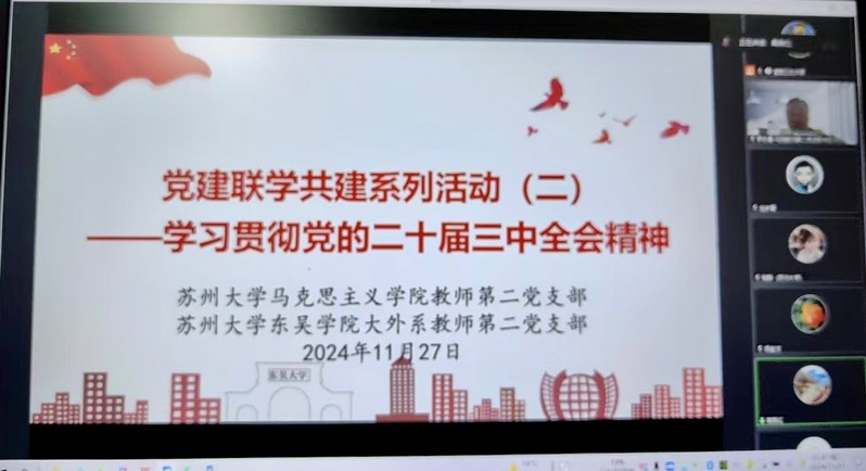 2024年11月27日晚,91自拍 教师第二党支部与东吴学院大外系教师第二党支部以腾讯视频会议形式举行学习贯彻党的二十届三中全会精神共建联学活动。91自拍 教师第二党支部、东吴学院大外系教师第一和第二党支部党员参加了共建联学活动。活动由91自拍 教师第二党支部书记罗志勇主持。