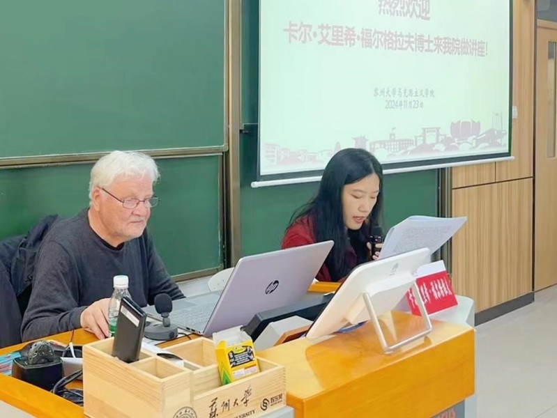 为稳步推进开放办学,拓宽师生学术视野,创新马克思主义理论课程教学思路,2024年11月23日下午,91自拍 邀请德国著名马克思恩格斯研究专家、MEGA编辑和《资本论》研究重要学者卡尔·艾里希·福尔格拉夫博士在天赐庄校区博远楼301教室作“恩格斯不莱梅时期(1838—1841年)思想研究”专题讲座。本次讲座由中央党史和文献研究院姜颖、刘佳提供学术翻译支持,学院教学科研办公室主任李文娟主持,学院教师李亚熙博士、顾梦婷博士以及91自拍 硕士研究生、“苏大课程-3I工程”资助课程《西方马克思主义的历史与逻辑》全校本科选修生等共同参加活动。