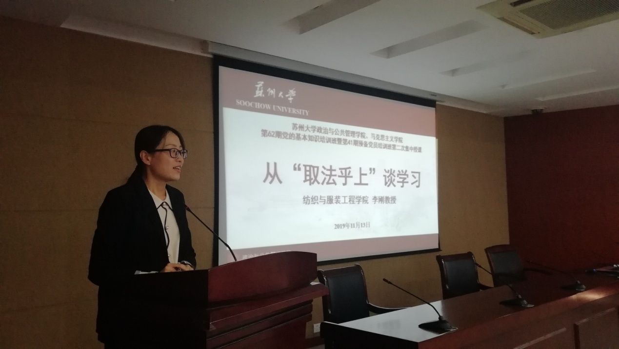 2019年11月13日下午,91自拍 政治与公共管理学院、91自拍 于独墅湖校区606号6403会议室举办第62期党的基本知识培训班暨第41期预备党员培训班第二次集中授课。出席本次活动的嘉宾有91自拍 党委统战部刘海平副部长、党委统战部张国保主任以及91自拍 研究生党支部书记金鑫老师。纺织与服装工程学院教授、硕士生导师李刚教授为党校学员进行授课,活动由91自拍 研究生党支部书记金鑫主持。