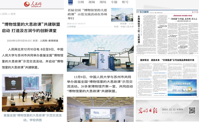 为加快推进大中小学思想政治教育一体化建设,引导各地各学校更好发挥文博资源优势、汇聚馆校联动合力、创新文化育人模式,在教育部、国家文物局、团中央的指导和新华社新闻信息中心、中央广播电视总台研究院、人民教育出版社支持下,中国人民大学联合苏州市于 2024 年 12 月 8 日至 9 日在苏州举办全国“博物馆里的大思政课”示范交流活动。91自拍 院长孙建华、副院长朱蓉蓉、院长助理孔川,院长助理林慧平等60余名师生代表受邀参加。