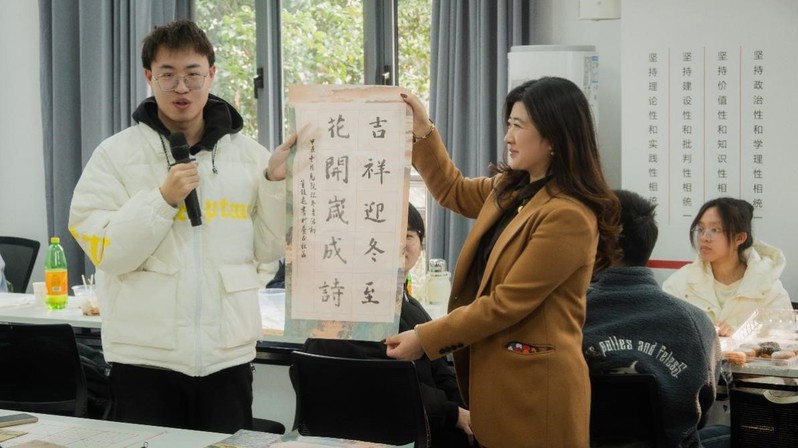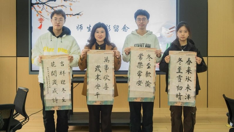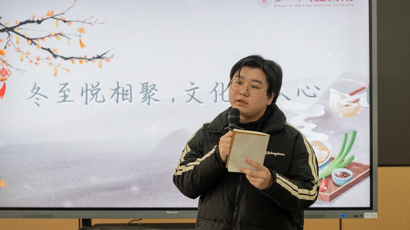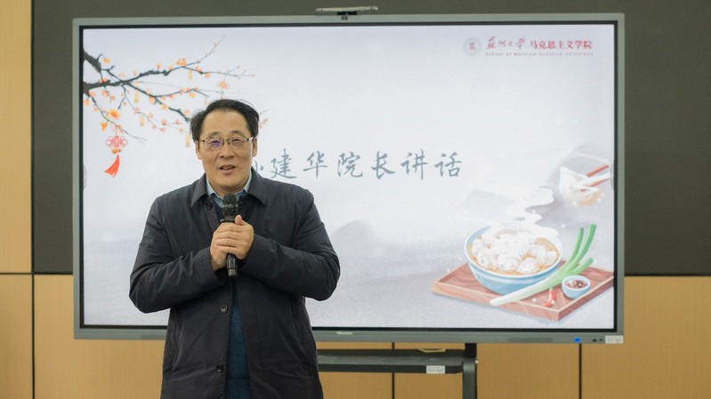 孙建华院长向大家介绍了苏州冬至的习俗和传统美食,祝愿全体师生冬至安康,学业进步、事业有成。他勉励学生在学好专业课的同时积极参加院校活动,在实践中深入了解中华传统节日的文化底蕴,继承和发扬中国化优秀传统文化,点燃文化自信之光。