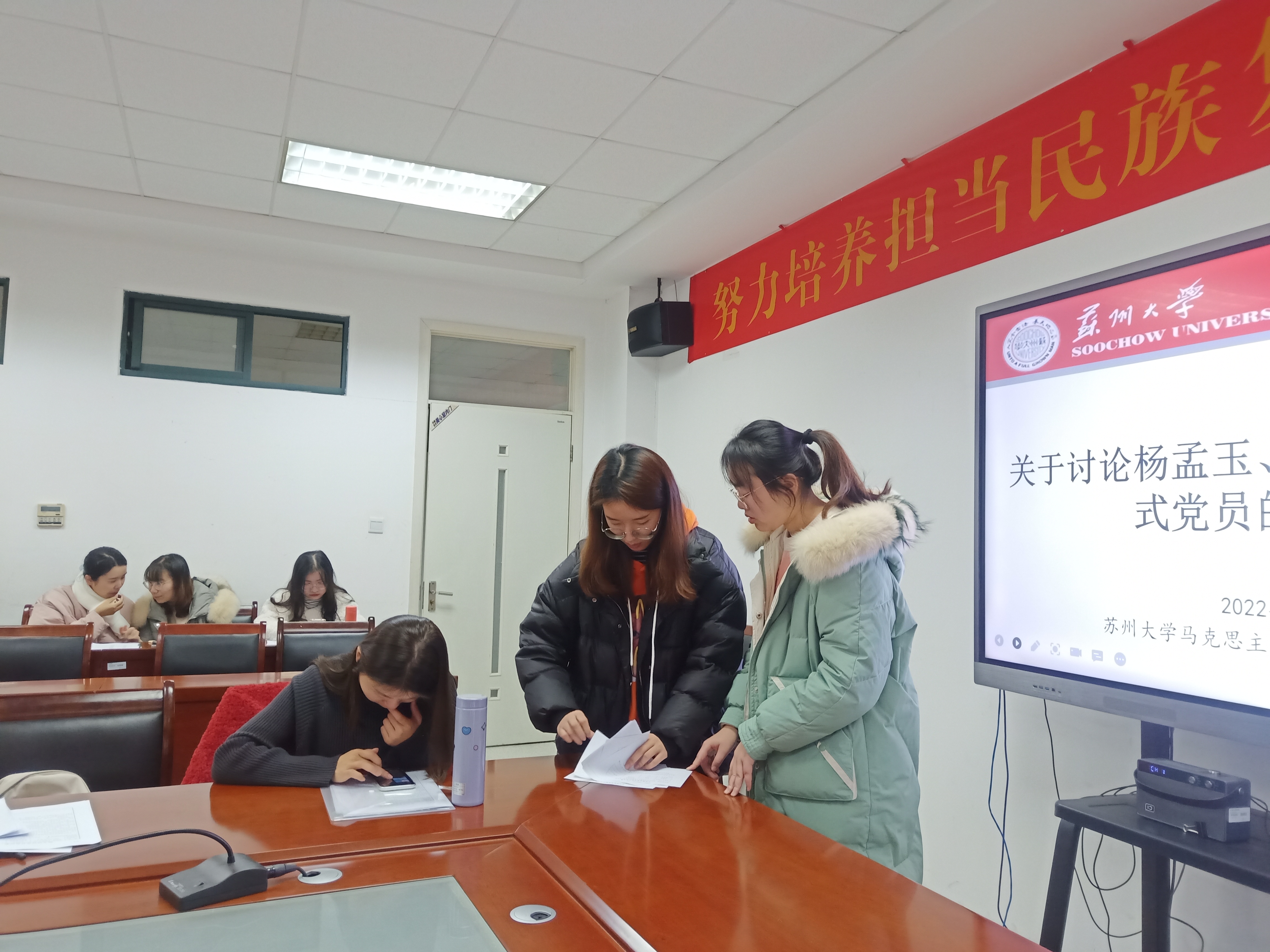 研究生第二党支部召开预备党员转正大会,讨论吴漫玲、杨孟玉两位预备党员转正事项。本次大会在独墅湖校区606号楼6418会议室举行,会议由研究生第二党支部书记李真同志主持。
