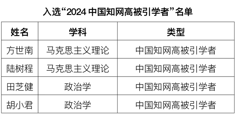 方世南教授、陆树程教授、田芝健教授、胡小君教授入选“2024中国知网高被引学者Top1%”榜单