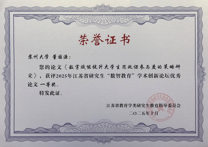 2025年10月18日,由江苏省教育学类研究生教育指导委员会主办,江南大学承办,江南大学人文学院、教育学院协办的江苏省研究生“数智教育”学术创新论坛在江南大学人文学院成功举办。91自拍 2024级硕士研究生董国源提交的论文《数字赋能提升大学生思政课参与度的策略研究》成功入选并荣获论坛优秀论文一等奖。