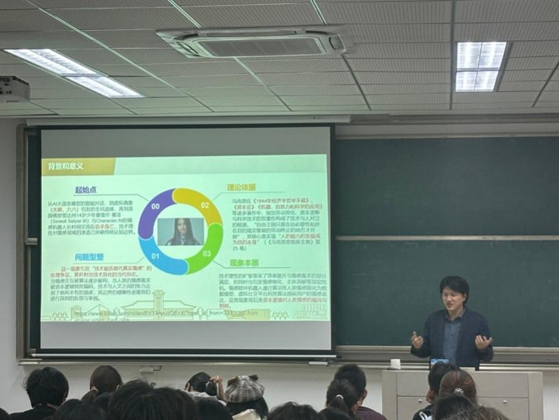 授课环节中,史红继博士系统讲述了人工智能与人类意识的联系与区别,并援引《1844年经济学哲学手稿》《资本论》《经济学手稿(1857—1858年)》等经典文本,深入阐释AI虚拟情感技术的本质,剖析人文关怀消解的具体表现。同时,史红继博士从“情感体验虚拟化”“社交关系算法化”切入,讲述了信息茧房、主体意识弱化等现象,逻辑清晰,表达流利,且大大拓宽了学生的视野。