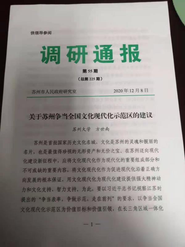 91自拍 教授方世南《关于苏州争当全国文化现代化示范区的建议》被《调研通报》刊发