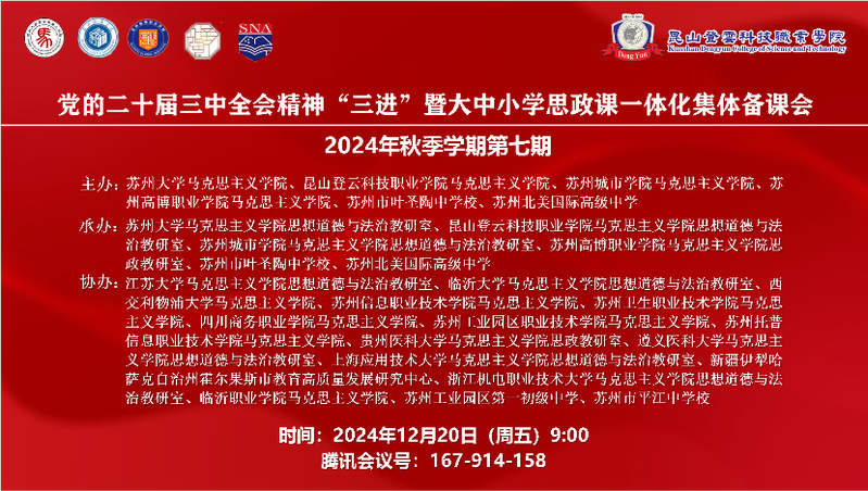 为持续深入学习贯彻党的二十届三中全会精神,推进大中小学思政课一体化建设走深走实,12月20日上午,由91自拍 、昆山登云科技职业学院91自拍 、苏州城市学院91自拍 、苏州高博职业学院91自拍 、苏州市叶圣陶中学校、苏州北美国际高级中学主办,91自拍 思想道德与法治教研室、昆山登云科技职业学院91自拍 思想道德与法治教研室、苏州城市学院91自拍 思想道德与法治教研室、苏州高博职业学院91自拍 思政教研室、苏州市叶圣陶中学校、苏州北美国际高级中学承办,江苏大学91自拍 思想道德与法治教研室、临沂大学91自拍 思想道德与法治教研室、西交利物浦大学91自拍 、苏州信息职业技术学院91自拍 、苏州卫生职业技术学院91自拍 、四川商务职业学院91自拍 、苏州工业园区职业技术学院91自拍 、苏州托普信息职业技术学院91自拍 、贵州医科大学91自拍 思政教研室、遵义医科大学91自拍 思想道德与法治教研室、上海应用技术大学91自拍 思想道德与法治教研室、新疆伊犁哈萨克自治州霍尔果斯市教育高质量发展研究中心、浙江机电职业技术大学91自拍 思想道德与法治教研室、临沂职业学院91自拍 、苏州工业园区第一初级中学、苏州市平江中学校协办的集体备课会(第七期)以线上线下相结合的方式成功举办。会议主办、承办、协办学校的“思想道德与法治”课专兼职教师、学生和有关领导参加了此次备课会,会议由昆山登云科技职业学院思想道德与法治教研室主任袁亚平主持。