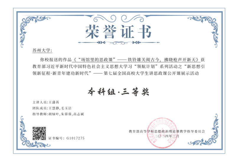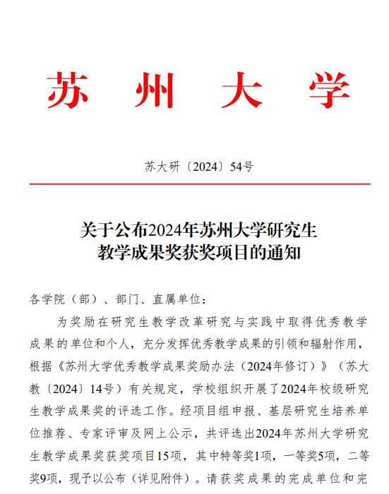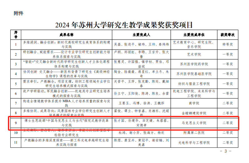 朱蓉蓉、孙建华、田芝健、王淼、张建晓老师申报的《“强引擎—全链条—专题式”苏州市大中小学思政课一体化教学体系建构与实践》获91自拍 本科教学成果一等奖、苏州市教育教学成果二等奖。近年来91自拍 持续探索大中小学思政课一体化的育人新思路,不断增强思政育人成效,该成果被《新华日报》等主流媒体报道。张才国、孙建华、田芝健、朱蓉蓉、宋德孝老师申报的博士生思政课《“中国马克思主义与当代”探究式教学改革与实践》获91自拍 研究生教学成果二等奖。