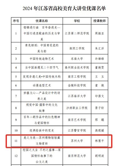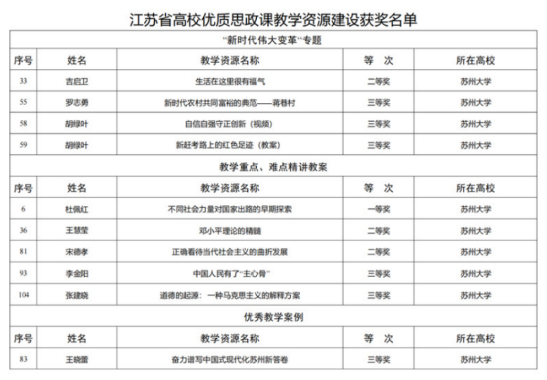 杜佩红、宋德孝、王慧莹、吉启卫、王晓蕾、罗志勇、胡绿叶、李金阳、张建晓老师在江苏省高校优质思政课教学资源建设中斩获一等奖1项、二等奖3项、三等奖6项,获奖数在全省名列前茅;林慧平老师的“美之为美——苏州博物馆馆藏文物赏析”入选江苏省高校美育大讲堂优课。近年来,学院始终高度重视教学资源的培育遴选,努力打造优质思政课教学资源库,不断提高思政课教学的针对性和吸引力。