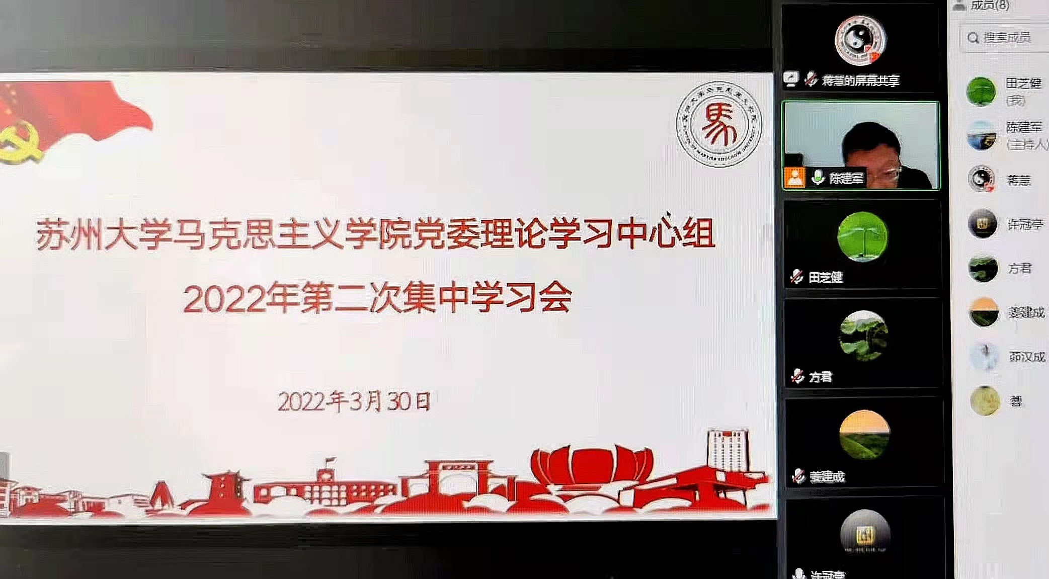 党委理论学习中心组在线召开2022年第二次集中学习会。本次学习会的主题是“学习贯彻全国两会精神 奋力开创高质量发展新局面”。学院党委理论学习中心组全体成员参加了学习会。会议由学院党委书记陈建军主持。