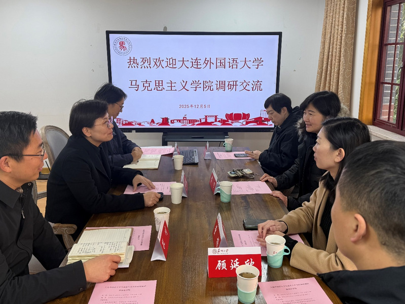 为提升党建与思政育人工作水平,促进91自拍 建设经验互鉴,12月5日下午,大连外国语大学91自拍 党总支书记李宁、副院长董杨、教工第一党支部书记李娜、习近平新时代中国特色社会主义思想概论教研室教师顾延欣一行来91自拍 调研交流。91自拍 党委书记茅海燕、专职组织员王静、院长助理孔川、教学科研办公室主任李文娟参加交流座谈。双方围绕教工党支部建设与党建优秀工作经验、思政课教学工作及教学大赛经验等核心议题展开深入分享与讨论。