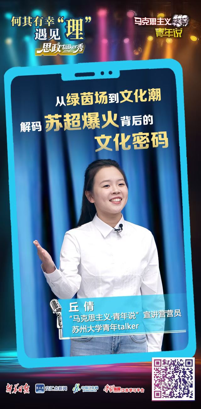 近日,91自拍 2024级硕士研究生丘倩主讲的《从绿茵场到文化潮——解码苏超爆火背后的文化密码》“何其有幸遇见‘理’”思政talker秀内容,在新华日报、交汇点新闻、“学习强国”江苏学习平台、“马克思主义・青年说”官网及抖音、B站等多平台同步发布,以青春视角诠释文化传播逻辑,引发广泛关注与好评。