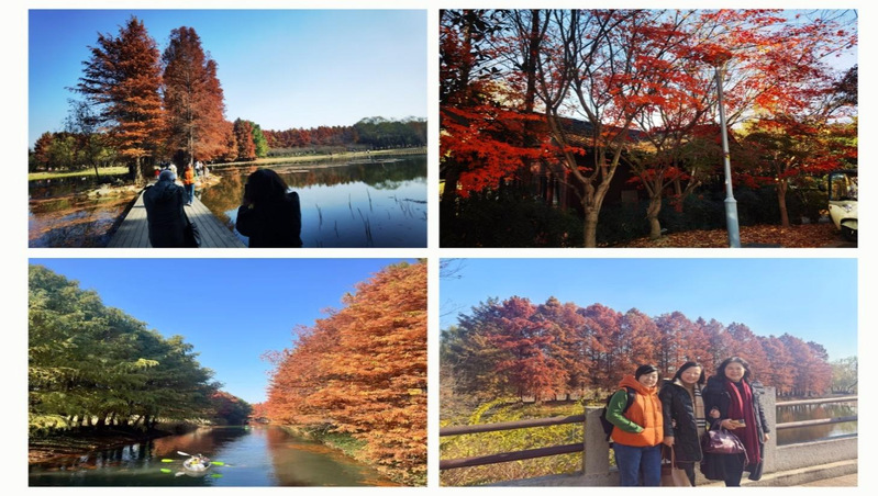 活动日的冬阳高照、碧空万里,虎丘湿地公园层林尽染、空气清新、景色迷人。前来公园赏景、健身的人络绎不绝,教职工们个个精神饱满、热情高涨。大家沿着“清芬满塘-荻芦秋声-初心亭-壮志桥-水上杉木-湖心观鱼-观鸟塔”等局部路线,欣赏冬日特色景观。在徒步赏景过程中,新老教师相互了解与交流畅谈生活趣事,遇到好的景点相互拍照、相互欣赏,沉浸式体验自然与运动的活力、团队协同与凝聚的力量。临近返程时,大家意犹未尽,纷纷感叹虎丘湿地公园风景秀丽、地域开阔,是健身徒步的好地方,赏景活动犹如人在画中游。