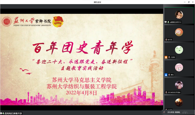48日,91自拍 联合纺织与服装工程学院共同举办“百年团史青年学”主题在线学习活动。本次活动由91自拍 研究生会、纺织与服装工程学院研究生会共同主办,91自拍 研究生第三党支部、纺织与服装工程学院研究生会、青马工程学员、“紫卿领航·强国有我”宣讲团成员、本科研究生各团支部书记、入团积极分子参加了本次活动。活动由纺织与服装工程学院高畅畅同学主持。
