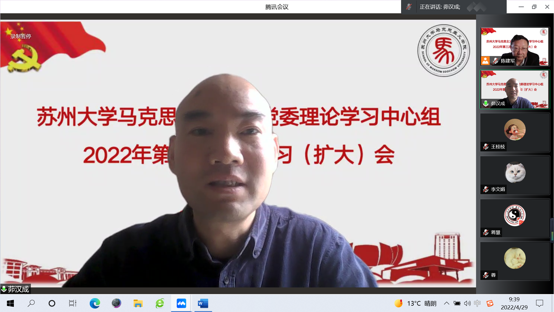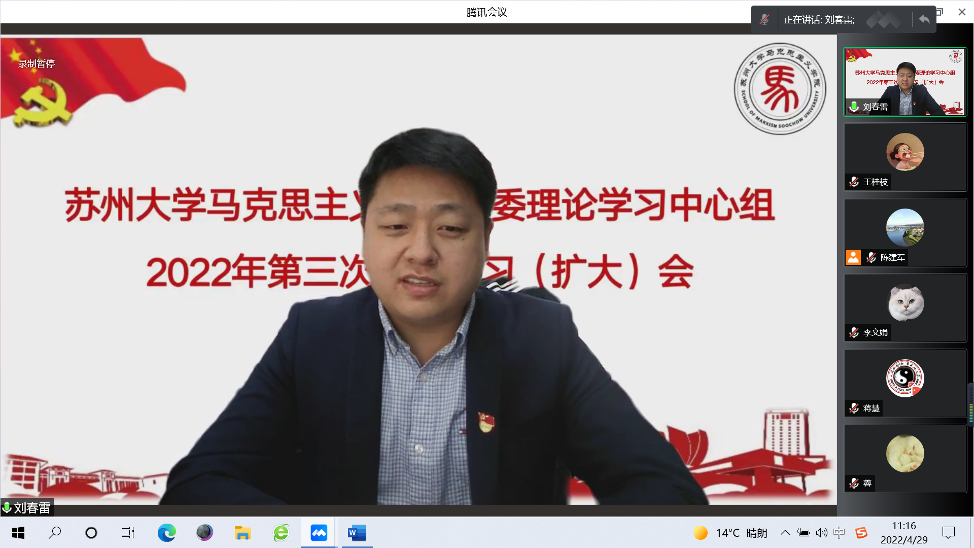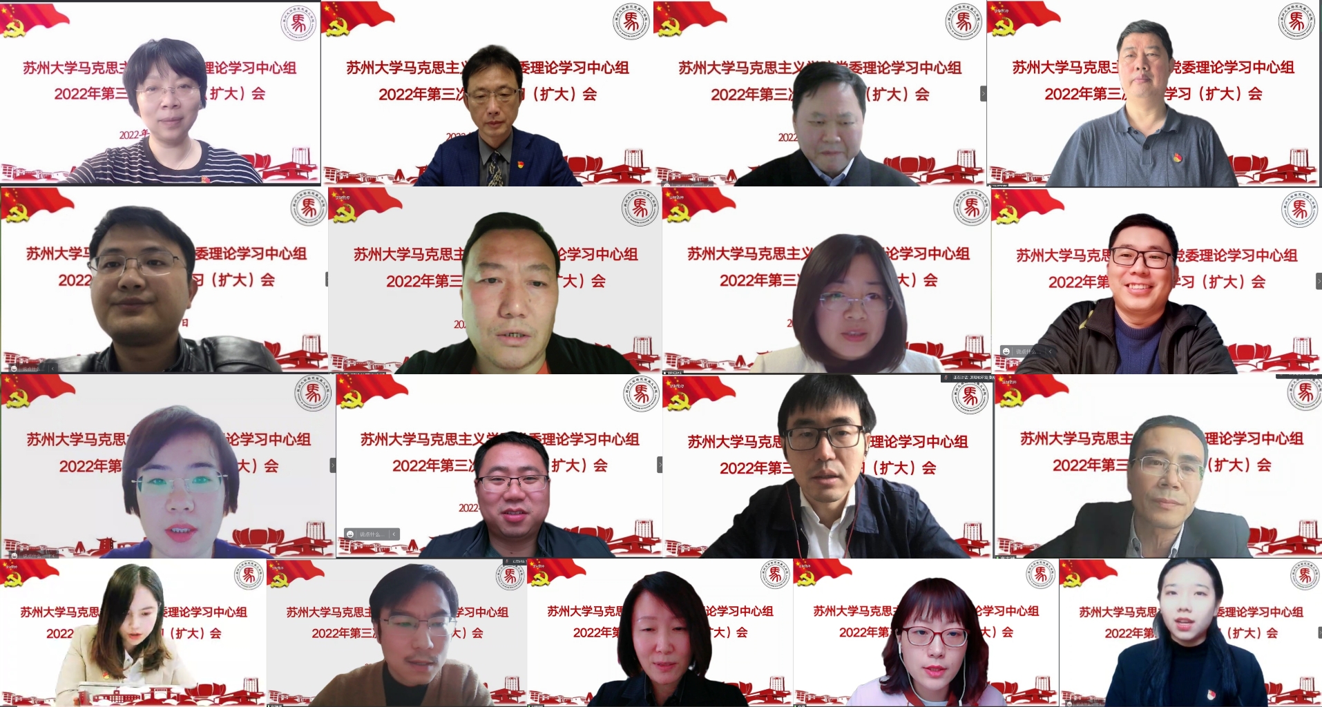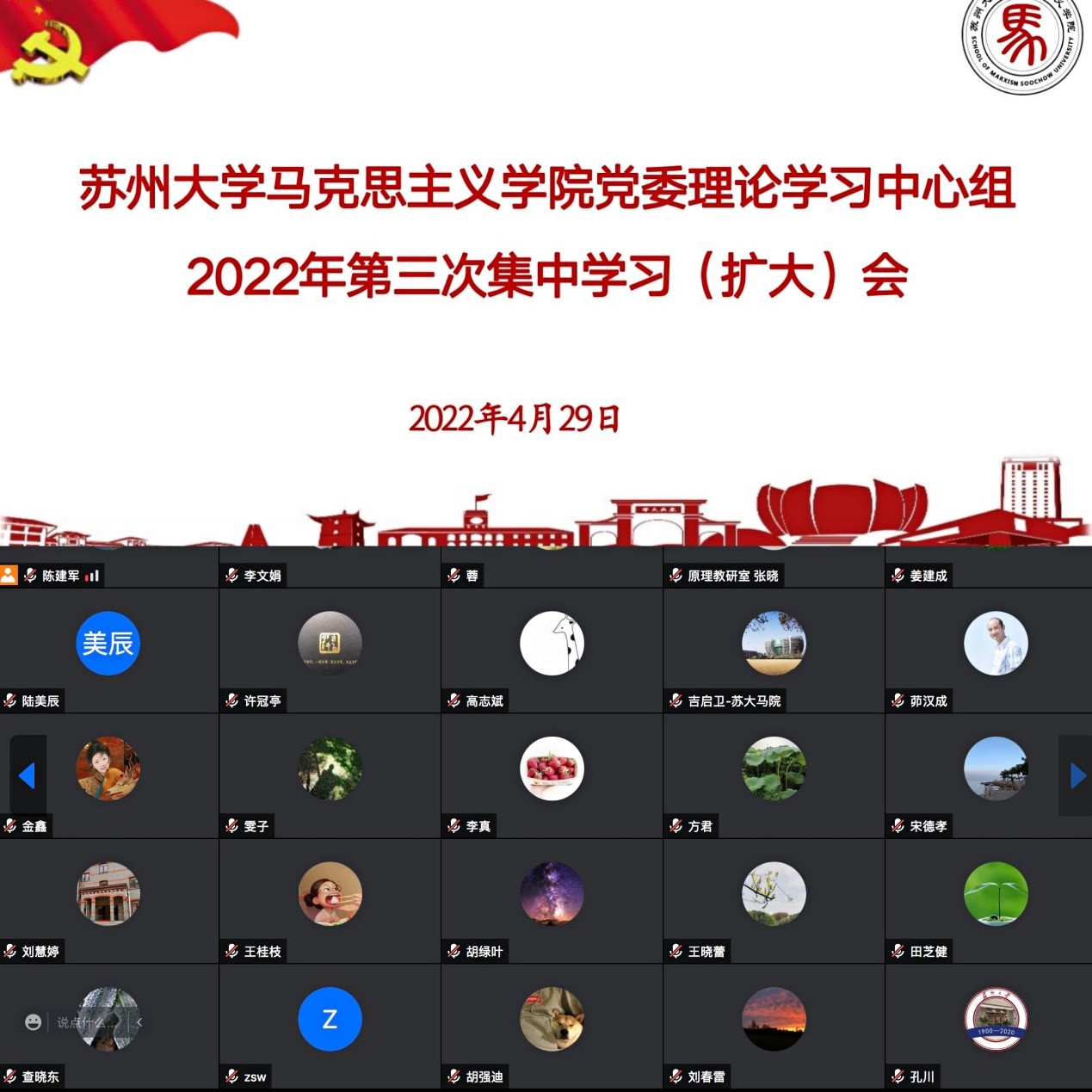 4月29日上午,91自拍 党委理论学习中心组在线召开2022年第三次集中学习(扩大)会,专题学习习近平总书记在中国人民大学考察时重要讲话精神。校党委理论学习中心组巡学旁听第一组组长、校党委办公室主任刘春雷,副组长、校党委办公室副主任查晓东,秘书、校党委办公室综合科科长张雯到会巡学旁听指导。学院党委理论学习中心组全体成员、各党支部书记、各教研室主任、综合办公室主任等参加此次学习会。会议由学院党委书记陈建军主持。