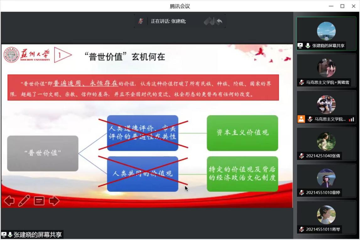 2021级研究生班主任张建晓老师作为此次公开课的主讲人,通过分析“普世价值”的语境殊异,揭示了“普世价值”的虚伪实质:西方国家所谓的“普世价值”实际上是资本主义价值观、是特定的价值观及背后的经济政治文化制度。张老师阐明了我们国家的价值选择是弘扬和平、发展、公平、正义、民主、自由的全人类共同价值,他号召同学们积极培育和践行社会主义核心价值观,对“普世价值”作出有力回击。