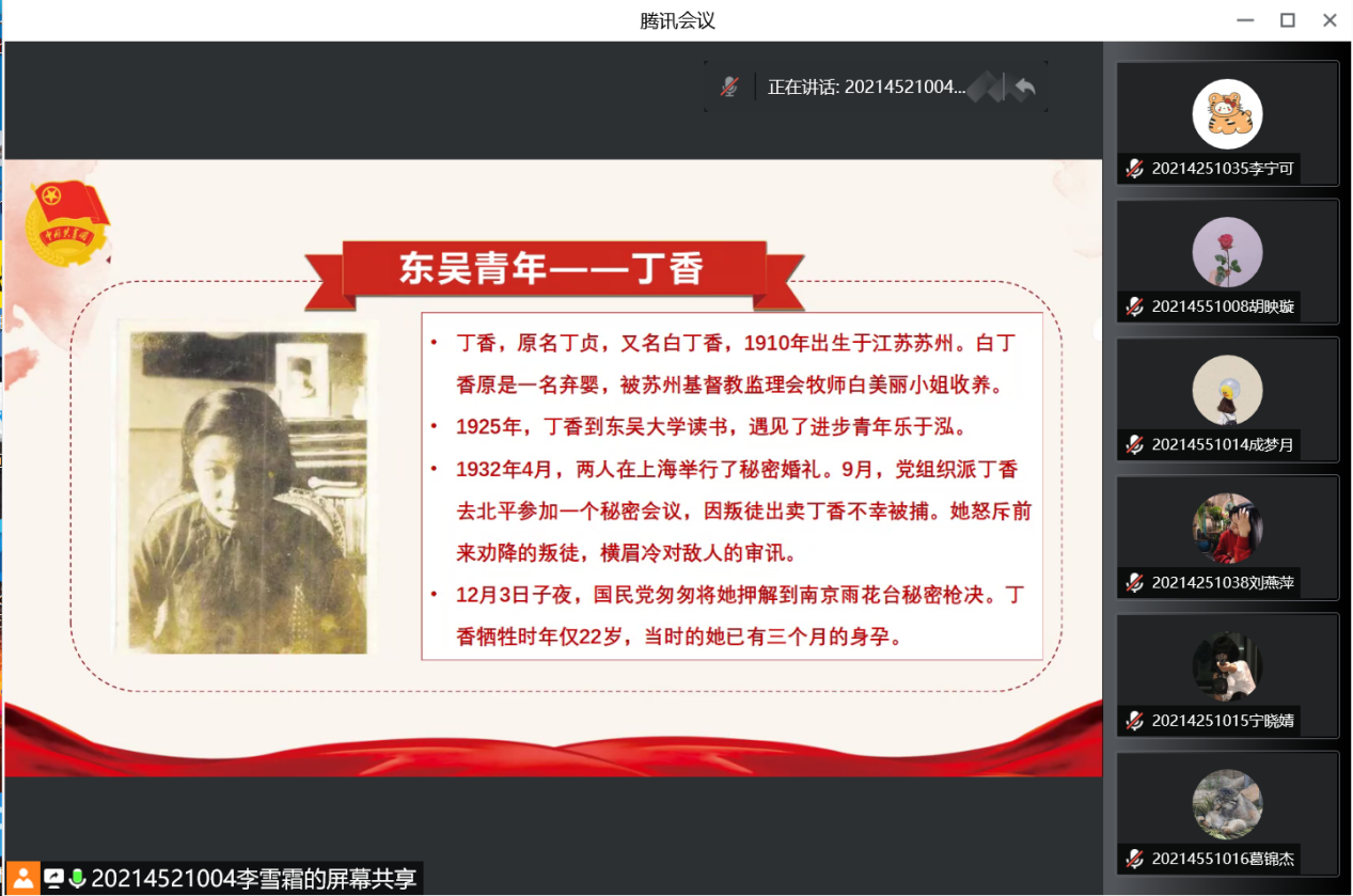 团委顺利召开“走进东吴青年 感悟使命担当”线上主题团课,旨在引导马院青年学子通过学习东吴青年的榜样故事,树立远大人生目标,担负起民族振兴的使命。本次活动由学院团委主办,2021级硕士研究生李雪霜主持。