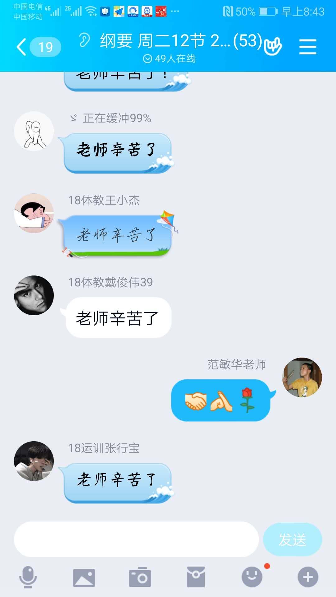 线上教学对于近现代史支部大部分拥有30余载教龄的老教师而言,是个巨大的挑战,更是创新教学模式、改进教学方法,实现教学互动与翻转教学的契机。全体教师变压力为动力,发扬“不辞辛劳,不畏艰难,不怕吃苦、不言放弃”的“四不”精神,认真准备,刻苦练习,不断测试与尝试,精心准备网络拥堵下的各种预案……终于赶在在2月24日线上教学开始前,学会了新技术,掌握了新本领。新学期第一周,老师们自信从容地走进了自己的直播间,当起了“网红主播”。从劳累紧张的网络直播间“见面课”中下来,老师们脸上流露着挑战自我的自信,洋溢出尝试全新教学方式带来的喜悦。眼见电脑屏幕跳动着学生赠送的一支支红玫瑰,耳闻同学们的暖心话语“我太爱了,这门课好有意思”、“老师辛苦了!”,这一刻,老师们的心头有无限感慨:之前的一切努力和付出,都值了!