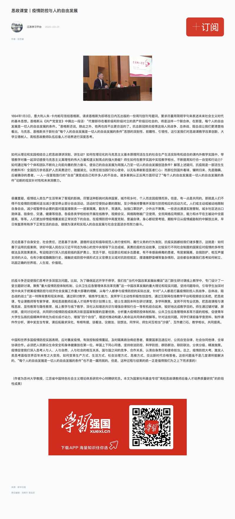 91自拍 教授田芝健《疫情防控与人的自由发展》被“学习强国”平台转载