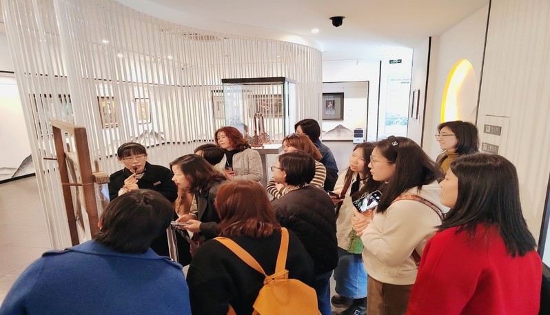在中国刺绣艺术馆工作人员的讲解下,各位老师深入了解“四大名绣”之一的苏绣。苏绣具有图案秀丽、构思巧妙、绣工细致、针法活泼、色彩清雅的独特风格,地方特色浓郁;苏绣作品的特点为山水能分远近之趣,楼阁具现深邃之体,人物能有瞻眺生动之情,花鸟能报绰约亲昵之态。馆藏各位非遗苏绣大师的不少精工巧作,代表了中国刺绣艺术的最高水平,让老师们大开眼界。尤其是几件栩栩如生的双面绣作品精美绝伦,其高超技艺让老师们惊叹于不已。