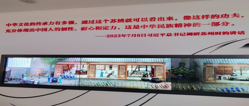 首先,大家一起参观苏绣小镇党群服务中心。这里是苏绣的发源地,具有2200多年的刺绣文化历史。该中心创办的“党建引领·绣美小镇”作为首个国企品牌获评高新区“十佳基层党建品牌”,是市属国资系统“海棠花红”先锋阵和高新区线下“政治信仰空间”示范建设点。