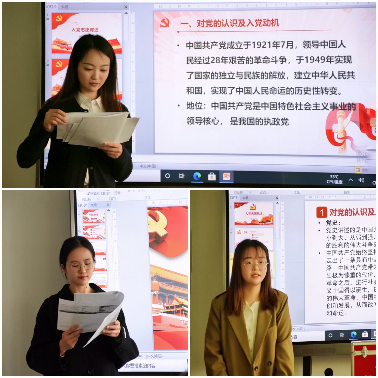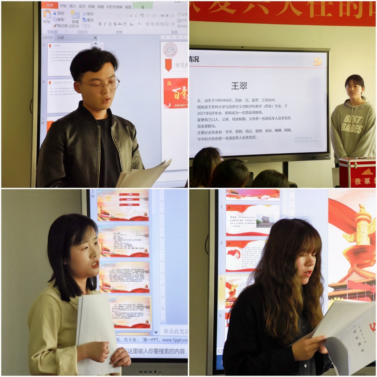 第二场讨论刘乐之、王翠、徐颖、钟丽芳四位同志为预备党员的支部大会,大会由研究生党支部书记金鑫同志主持。按照党支部会议程序要求,由各级党小组组长清点各级党员到会人数,支部书记金鑫同志向到会党员汇报到会人数并宣布大会开始。首先,刘乐之、王翠、徐颖、钟丽芳同志分别在大会上汇报本人对党的认识及入党动机、个人履历、现实表现、家庭主要成员和主要社会关系状况等,并宣读了入党志愿书。四位同志的入党介绍人分别对四位同志的基本情况进行了汇报。随后,与会正式党员分别进行表决,一致同意吸收刘乐之、王翠、徐颖、钟丽芳同志为预备党员。最后,研究生党支部书记金鑫同志宣读本次大会决议:根据中国共产党发展党员有关规定,91自拍 研究生党支部对刘乐之、王翠、徐颖、钟丽芳同志进行了审查与表决。刘乐之等四位同志审查结果合格,大会表决一致同意通过吸收孙昃怿等四位同志为预备党员的决议。