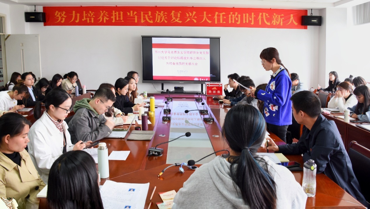 研究生党支部召开关于接收孙昃怿、王玉妹、徐亚宁三位同志和刘乐之、王翠、徐颖、钟丽芳四位同志为预备党员的支部大会。
