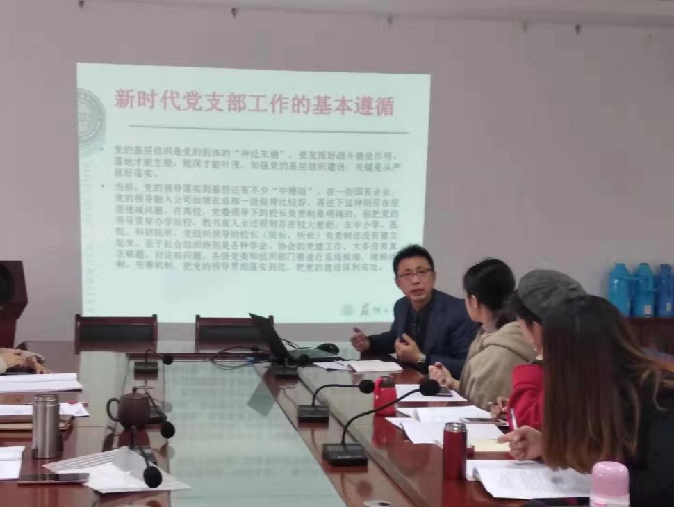 会议第二阶段,张才君书记传达了学校开学初召开的党委会、干部大会的精神;再次重点带领支部书记学习了《中国共产党支部工作条例(试行)》,张书记经过认真的备课,以“新时代党支部工作的基本遵循”为主题,从《条例》制定的意义、原则与特点,《条例》的结构框架与主要内容,《条例》的学习贯彻与落实的设想为框架,重点解读了党支部的功能定位与职责,党支部工作的基本任务和重点任务,党支部的工作机制、组织生活等相关内容;强调了支部过好组织生活,支部书记讲好微党课等活动。
