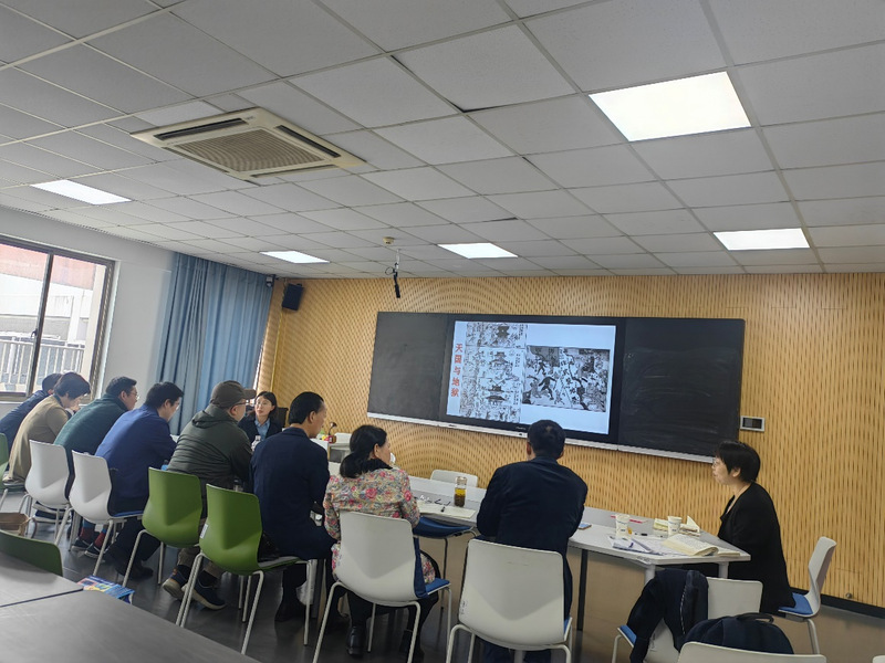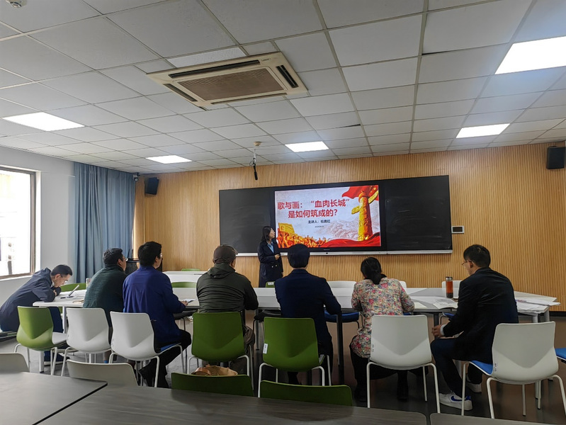 第一项议程是2024年江苏省高校微课教学备赛集体研课。杜佩红老师进行参赛微课“歌与画——‘血肉长城’是如何筑成的?”试讲,与会教师根据微课比赛要求,从微课选题、课程导入、主线贯穿、结构设计、逻辑层次、总结提升、课件优化、语言表达、教学仪态等方面进行了深入讨论和细致指导,在加大对青年教师指导培养的同时,更好推进新老教师的互学、互鉴、共进。